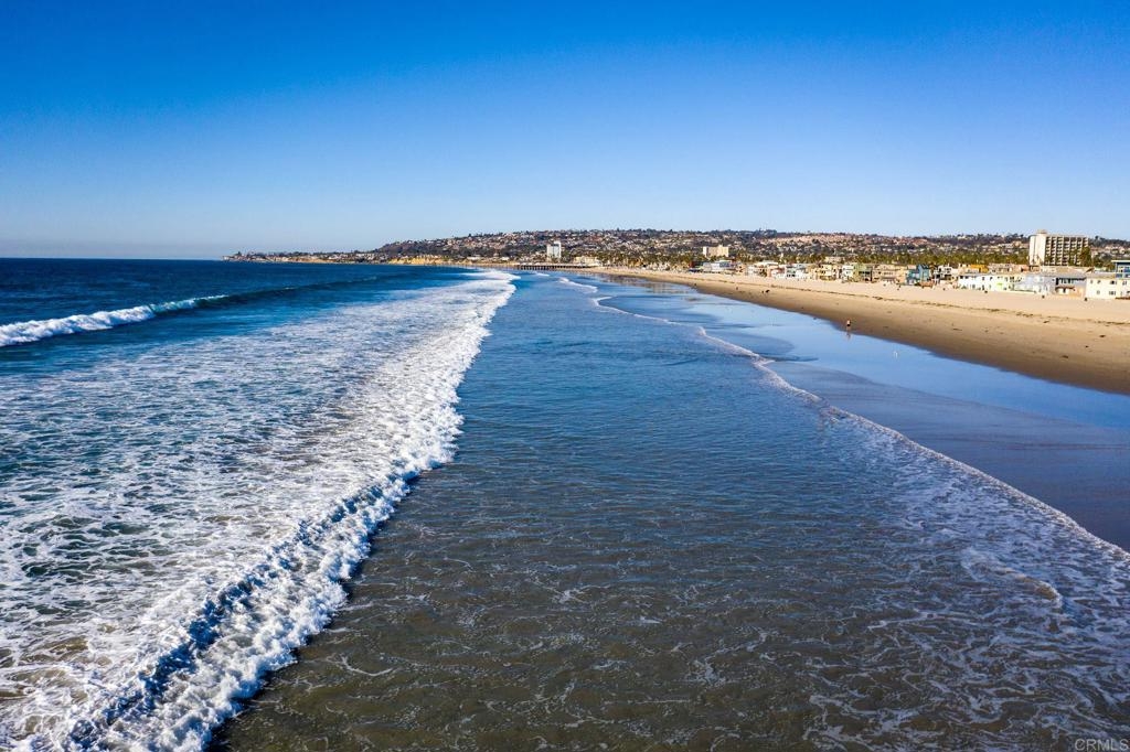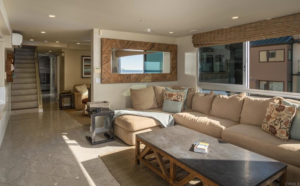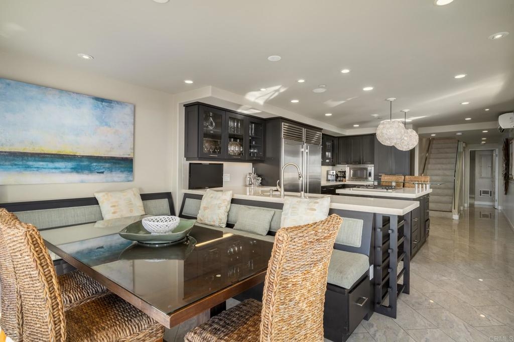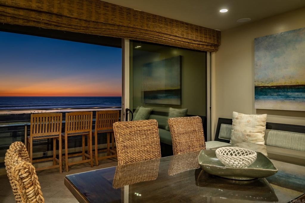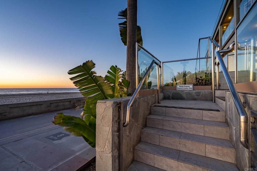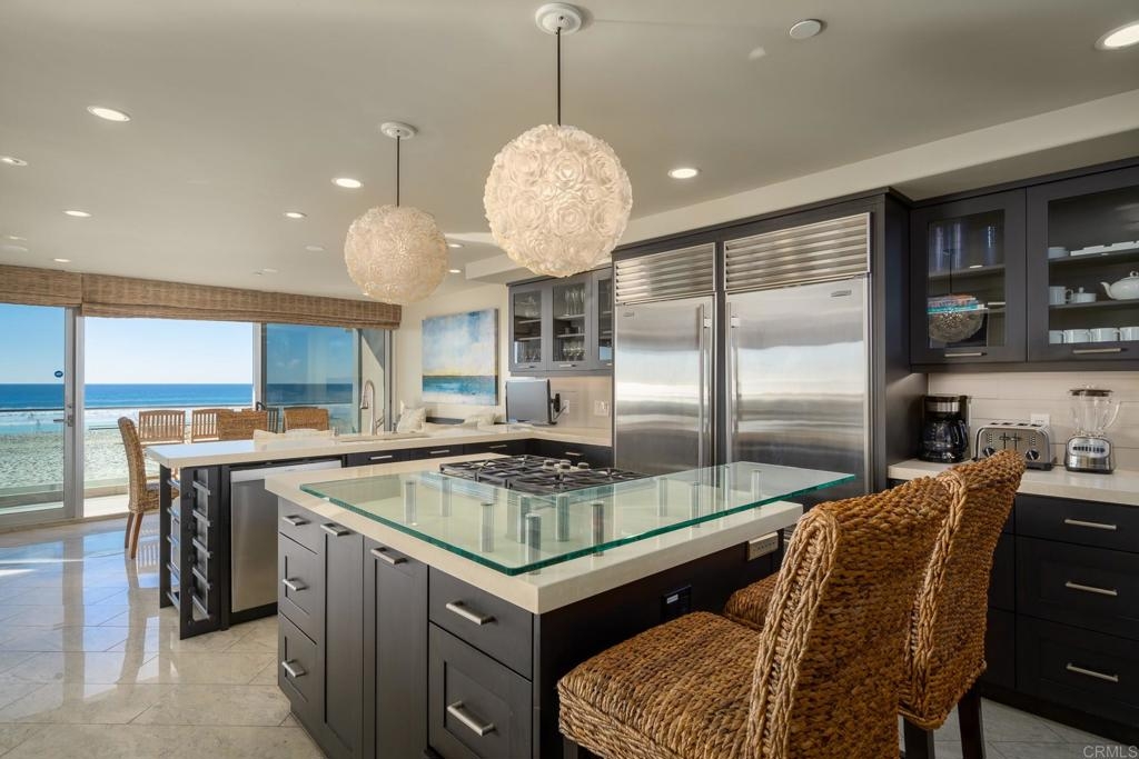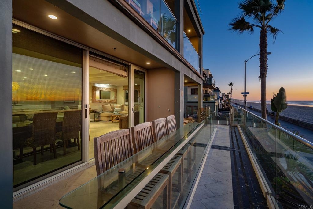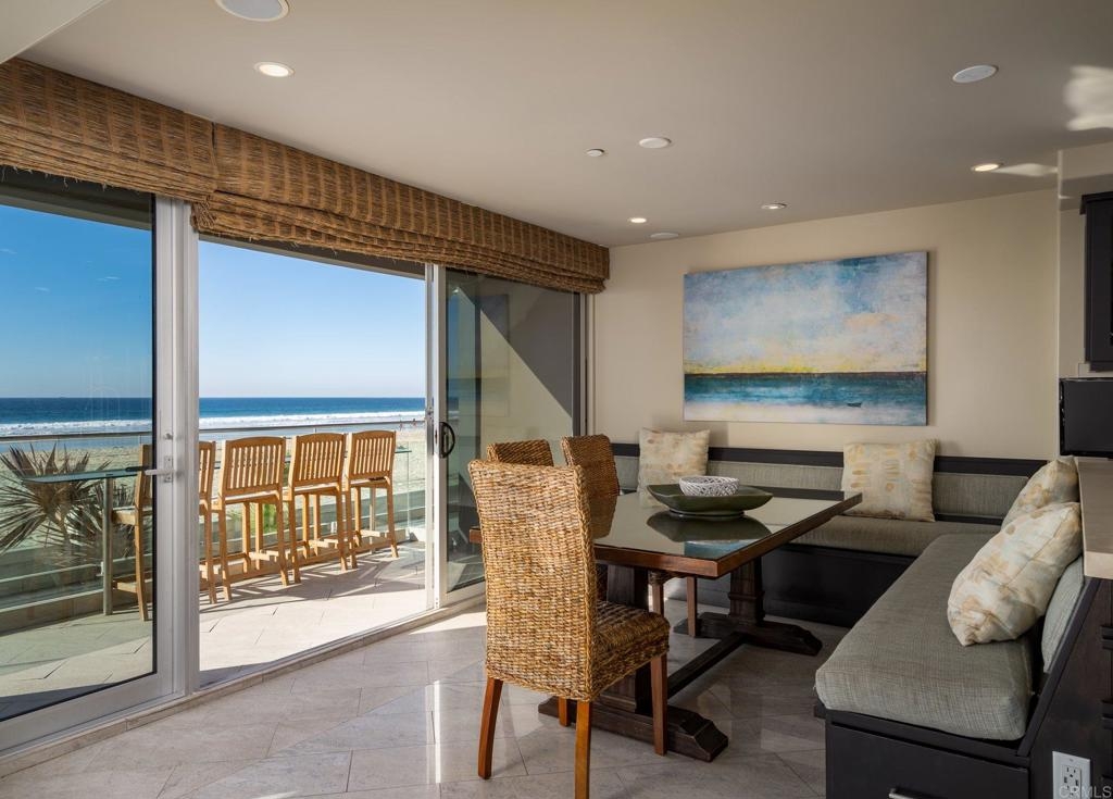 Experience San Diego’s ultimate beachfront lifestyle at this luxe on-the-sand residence that combines two units into one fully upgraded seaside condominium in Mission Beach. From its prime setting along the area’s famed boardwalk, where people watching is unparalleled, the home welcomes panoramic beach, ocean, whitewater, sunset and coastline views from most indoor and outdoor living areas. Floor-to-ceiling windows with remote-operated bamboo shades frame these views beautifully, complementing a two-story floor plan that sleeps up to ten. Opening to the split-level wraparound patio, which offers a BBQ, fire pit and after-beach shower, the main living areas showcase a warm contemporary style. Discover a family room, a dining room with built-in banquettes, and a den with built-in entertainment center. A high-end kitchen flows seamlessly to the surrounding living areas and boasts an island with elevated glass bar, quartz countertops, custom cabinetry with glass uppers, and top stainless steel appliances including a Bosch dishwasher, pro-level range and a double built-in refrigerator. Tile flooring, in-ceiling speakers, custom lighting fixtures, two underground parking spaces and an oversized locked storage area are also included.