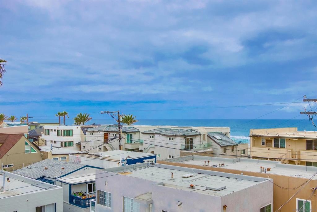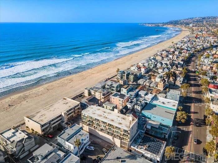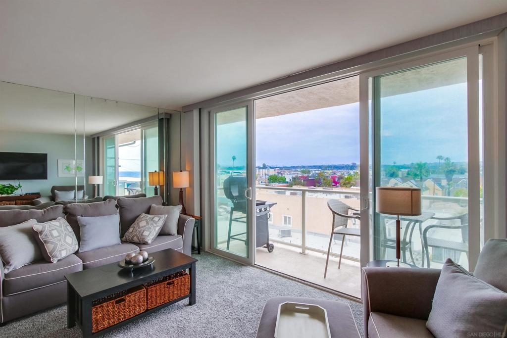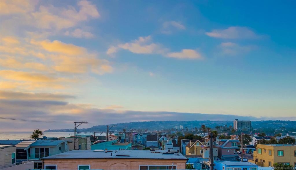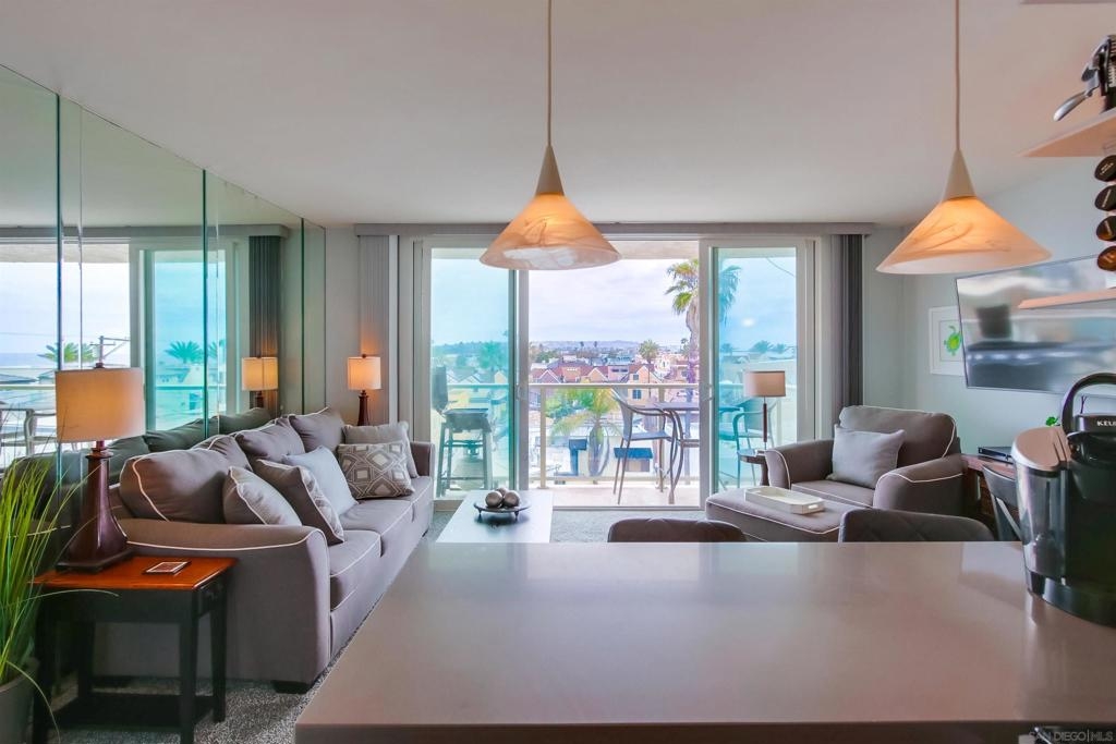 Welcome to your coastal retreat in the heart of Mission Beach, just steps from the sand! TOP FLOOR units in this building, tallest in the area, are RARELY available. This stunning condo has been meticulously updated to provide the ultimate beachfront living. From the moment you step inside you'll be captivated by the light-filled, open-concept design that seamlessly blends indoor & outdoor living. Expansive windows & spacious balcony showcase breathtaking 360° views, offering a front row seat to both sunrises over the Bay & vibrant sunsets over the ocean. A modern kitchen featuress sleek quartz counters, S/S appliances & breakfast bar to gather around. Step out onto the large alcony that feels like an extension of your living space. Here you can BBQ, dine, entertain guests while enjoying the view and gentle ocean breezes, a perfect spot to savor the coastal lifestyle. The bedroom offers view of Mission Bay, the pier and the coast to the north. The large closet features plenty of built-in organization. Bath has separate vanity area updated with quartz counter & vessel sink. With it's light, airy feel this unit feels much larger than its footprint. Security is a priority in this building. Residents enjoy peace of mind with a secure entry, gated parking & space to stow extra gear. The location allows you to easily immerse yourself in the vibrant energy of Missions Beach's boardwalk, dining & shopping scene & aquatic activities to be enjoyed on Mission Bay. Whether looking for a serene vacation escape or permanent home this is your chance to own a piece of paradise!
