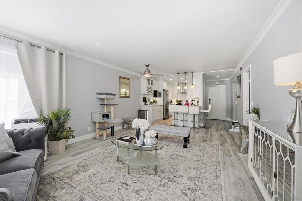 Rare CORNER unit, in a “No freeway noise location” of the complex! Best and quietest location. Welcome to the VERY sought-after Mission Ridge community of Mission Valley! (Visit Virtual Tour). This beautifully upgraded 1 bed, 1.5 bath condo is filled with natural light and enhanced privacy. The open living space features laminate wood flooring, quartz kitchen countertops, stainless steel appliances, and elegant rhinestone cabinet handles. The balcony has been fully enclosed in order to expand the Master bedroom, creating one of the largest bedrooms in the entire complex. Enjoy in-unit laundry, central air and heat, and resort-style amenities including an Olympic-size pool, spa, tennis courts, gym, racquetball, dog park, and clubhouse—all minutes from shopping, dining, parks, and freeways. Corner unit comes with 1 assigned parking space in carport with storage and 1 additional parking pass for guests. HOA includes trash and water! The complex has undergone resurfaced streets and new exterior painting, with the added convenience of Amazon secure delivery cubbies in the lobby of each building. The meticulously maintained grounds feature trimmed trees, ample guest parking, and no special assessments. Close proximity to shopping, nearby restaurants, 24 Hr fitness, Snapdragon Stadium, upcoming SDSU West, Mission Valley and the trolley make this location unbeatable. On-site amenities include a gym, rec room, and gas (for fireplace only), and water & trash paid by HOA. Don't miss out on this incredible opportunity for comfortable and convenient living.