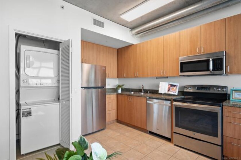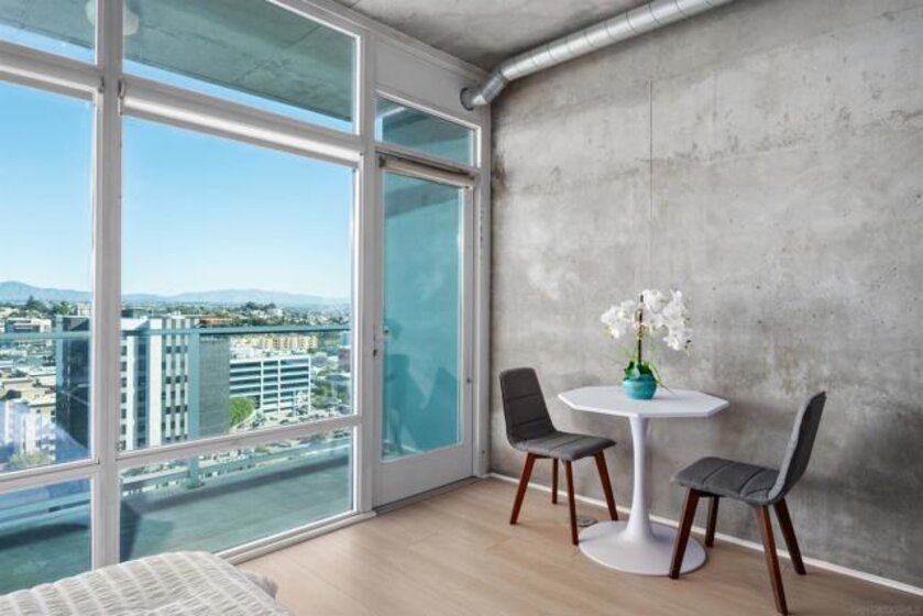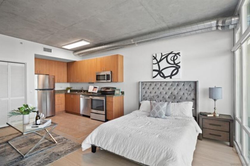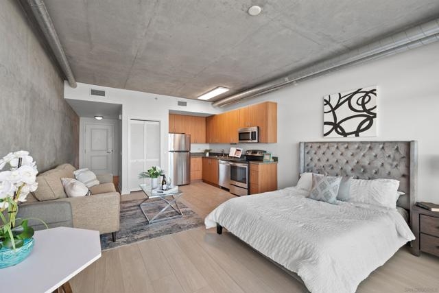 Elevate your urban lifestyle with this Smart Corner residence, ideally positioned in the vibrant heart of East Village. This east-facing studio is a true vantage point showcasing views of the city skyline, Balboa Park, distant mountains, and even glimpses of the iconic Coronado Bridge from your own balcony. Designed with an industrial-chic aesthetic, the home features stylish concrete accents and exposed ductwork that pair beautifully with the recently installed luxury vinyl plank flooring, creating a modern, loft-inspired atmosphere. The kitchen is equipped with updated stainless appliances, while the bathroom offers a practical shower/tub combination. Fresh interior paint and a secured parking space add to the comfort and convenience. Exceptionally versatile, this studio serves perfectly as a smart investment property, an efficient live-work space, or a serene urban retreat. Discover the ease of Downtown living in this East Village pied-à-terre, where dining, culture, and transit are just steps away. Smart Corner is an all-encompassing hub of work, play, shop, and live! It is conveniently located near the 163 freeway, I-5, Highway 94, Petco Park, the Gaslamp Quarter, and Balboa Park. A trolley station located directly below the building ensures Smart Corner has all an urban dweller could want. Amenities include a roof-top sun deck with spa, a barbecue area, gym, and wet bar on the 20th floor, and fully equipped exercise room. Welcome home!