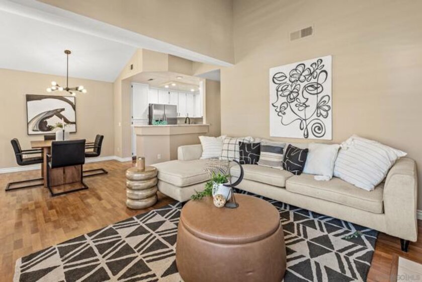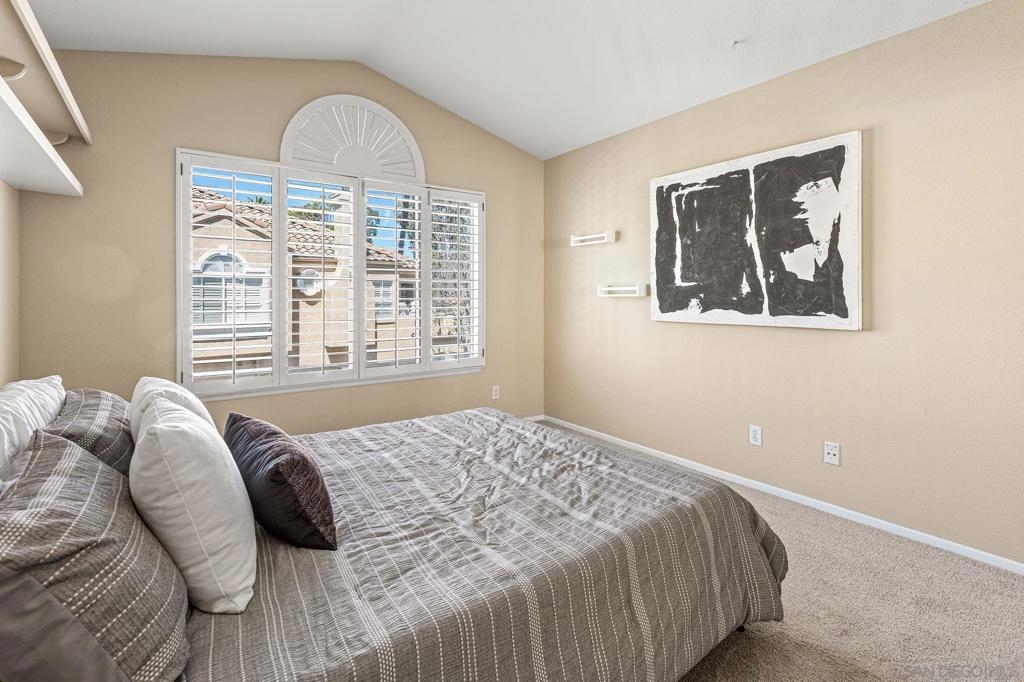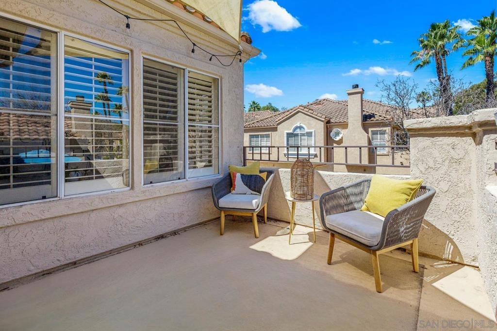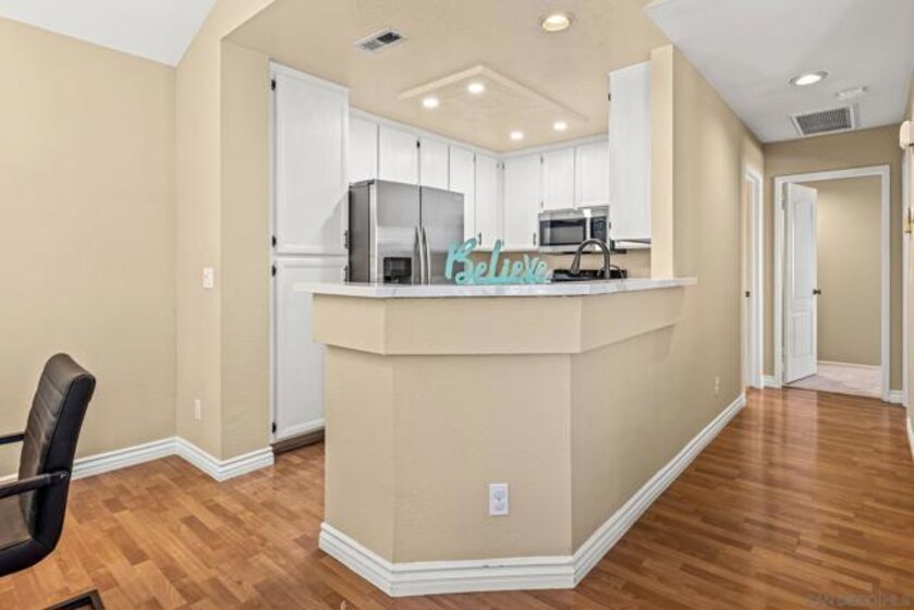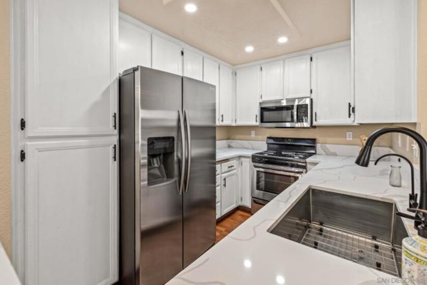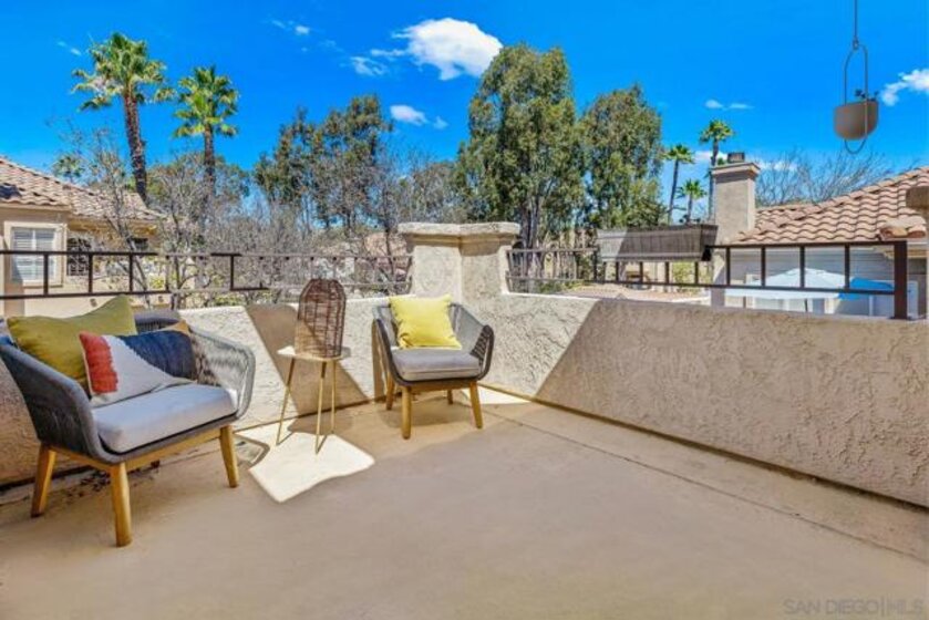 Tucked away at the end of a quiet cul-de-sac in the highly desirable Belsera community, this private 2-bedroom, 2-bath end unit offers the perfect blend of comfort, light, and lifestyle. With soaring ceilings and an open-concept design, the home feels bright and spacious from the moment you walk in, while its west-facing orientation helps keep the interior cooler during warmer months. The kitchen was updated in 2025 with refreshed quartz countertops, painted cabinetry, new sink and faucet, & upgraded lighting, opening seamlessly to the main living space ideal for both everyday living & entertaining. Additional improvements include fresh interior paint, brand new carpet, & a water heater and pressure regulator replaced in 2023. The bathroom was also upgraded in 2023 with new countertops, fixtures, glass shower doors, & a refinished tub, creating a clean & modern feel. Large windows bring in abundant natural light, while the elevated private balcony positioned above neighboring units offers a peaceful space to relax or host, overlooking greenspace and a seasonal creek during rainfall. Additional features include air conditioning, an attached one-car garage, a second assigned parking space, & in-unit washer and dryer. The home also benefits from a quiet setting, great neighbors, & a level of privacy that is hard to find. Residents of Belsera enjoy resort-style amenities including two swimming pools, picnic and BBQ areas, volleyball courts, scenic walking paths, and direct access to Mission Trails Regional Park—bringing an active, outdoor lifestyle right to your doorstep.