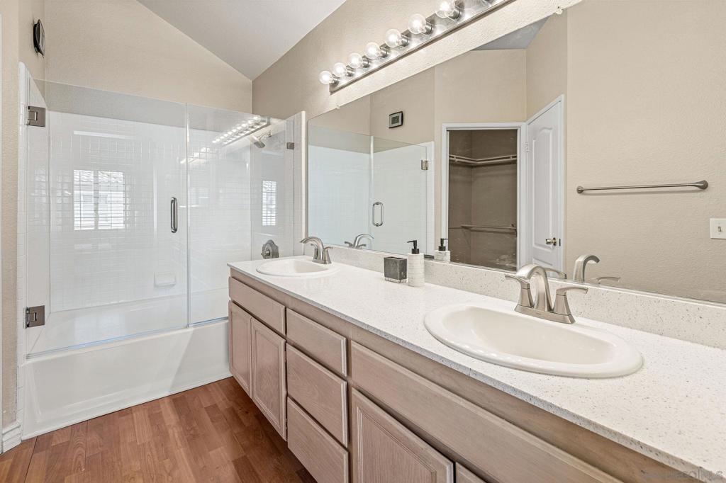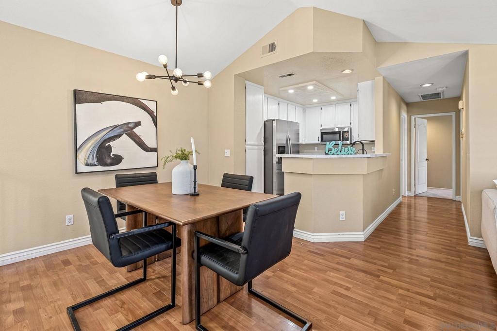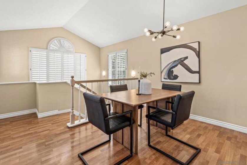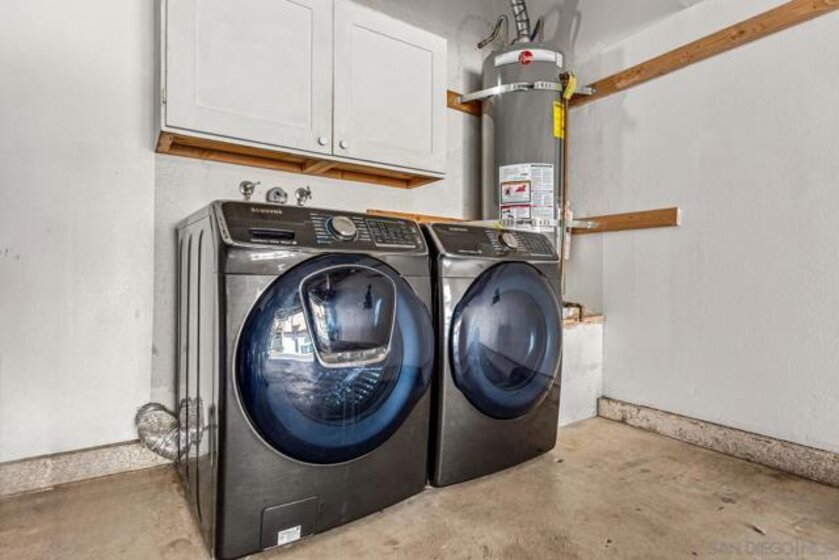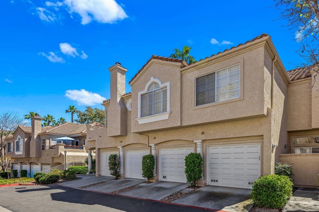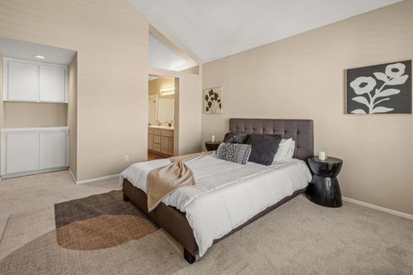 Tucked away at the end of a quiet cul-de-sac in the highly desirable Belsera community, this private 2-bedroom, 2-bath end unit offers the perfect blend of comfort, light, and lifestyle. With soaring ceilings and an open-concept design, the home feels bright and spacious from the moment you walk in, while its west-facing orientation helps keep the interior cooler during warmer months. The kitchen was updated in 2025 with refreshed quartz countertops, painted cabinetry, new sink and faucet, & upgraded lighting, opening seamlessly to the main living space ideal for both everyday living & entertaining. Additional improvements include fresh interior paint, brand new carpet, & a water heater and pressure regulator replaced in 2023. The bathroom was also upgraded in 2023 with new countertops, fixtures, glass shower doors, & a refinished tub, creating a clean & modern feel. Large windows bring in abundant natural light, while the elevated private balcony positioned above neighboring units offers a peaceful space to relax or host, overlooking greenspace and a seasonal creek during rainfall. Additional features include air conditioning, an attached one-car garage, a second assigned parking space, & in-unit washer and dryer. The home also benefits from a quiet setting, great neighbors, & a level of privacy that is hard to find. Residents of Belsera enjoy resort-style amenities including two swimming pools, picnic and BBQ areas, volleyball courts, scenic walking paths, and direct access to Mission Trails Regional Park—bringing an active, outdoor lifestyle right to your doorstep.