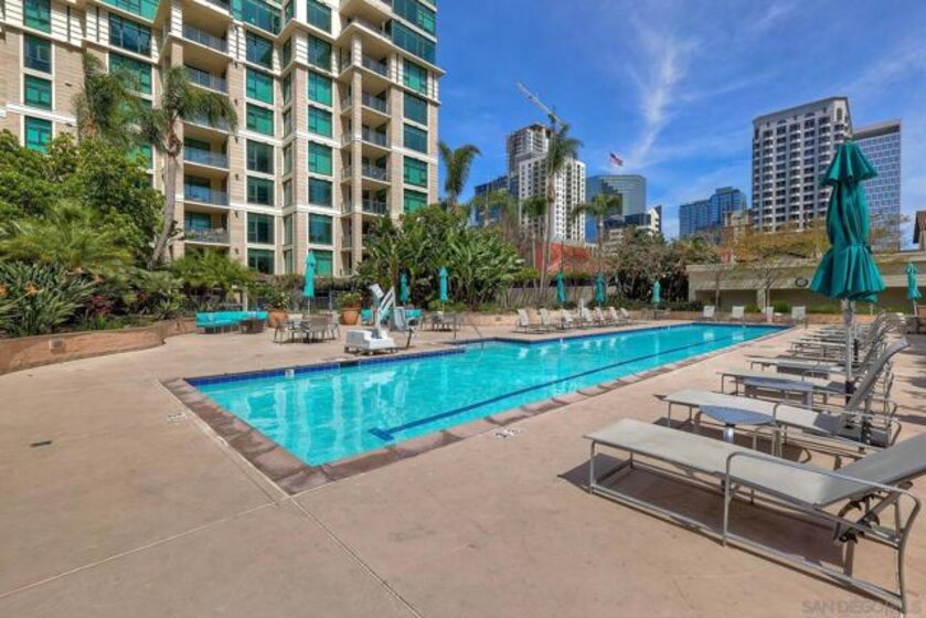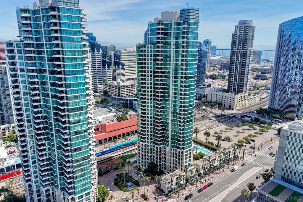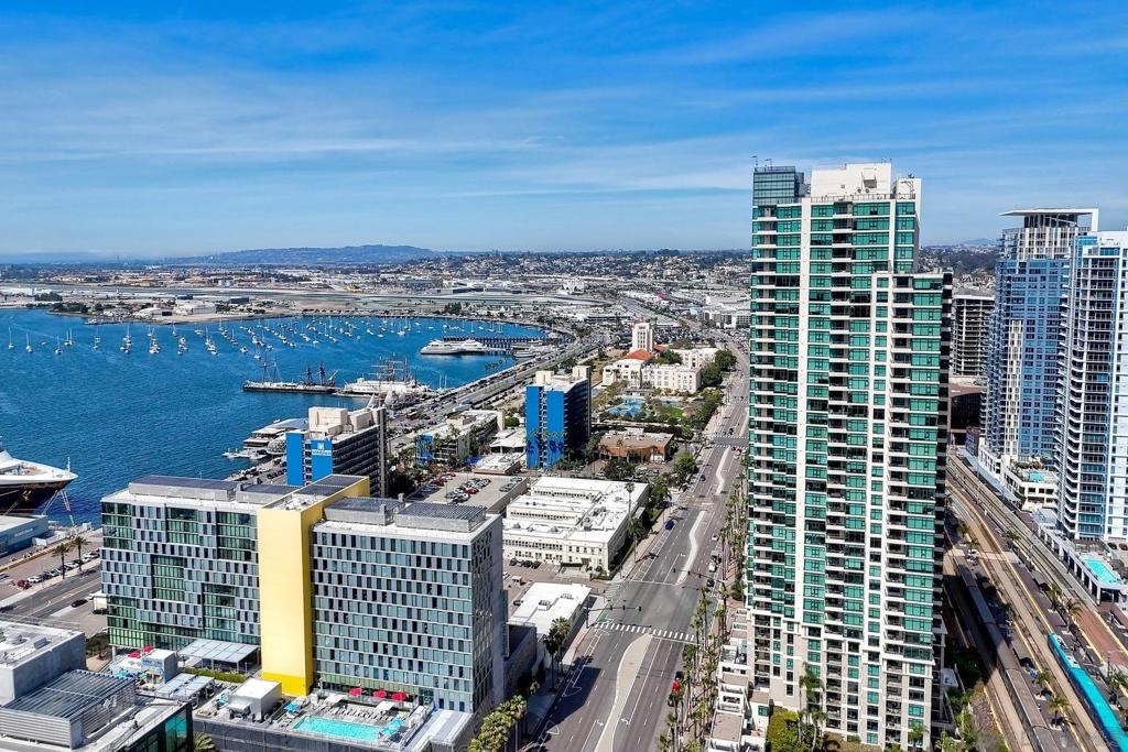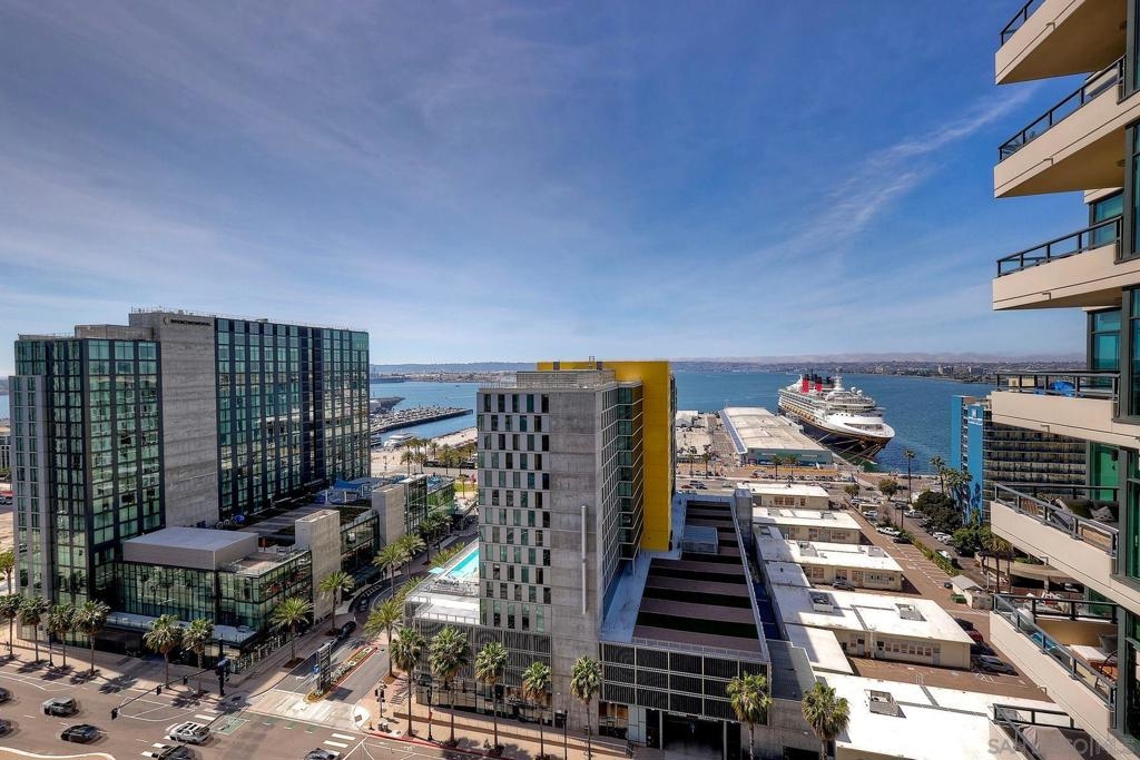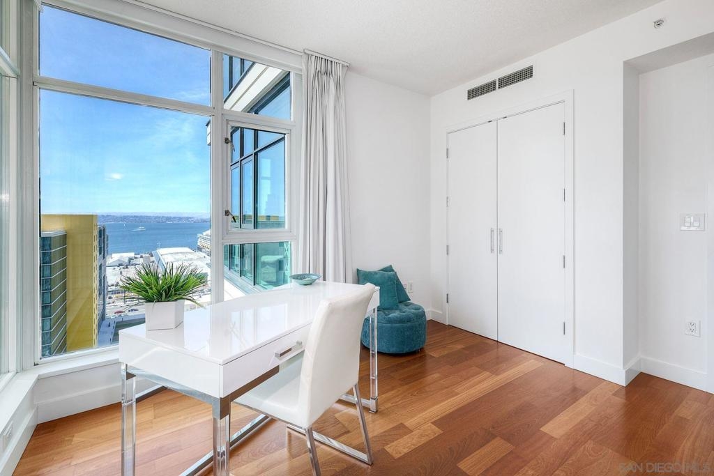 Elegant ocean and bay view residence in Grande South featuring the most desirable floorplan with two bedrooms plus a bonus room. Situated on the 18th floor, the home offers unobstructed southwest-facing views of San Diego Bay, the Pacific Ocean, and the city skyline. Refined interiors include a spacious primary suite, hardwood floors throughout, a cozy fireplace, Nest thermostats, battery-operated window shades, and a gourmet kitchen with a new GE Monogram refrigerator. The expansive balcony extends the living space and provides the perfect setting to enjoy panoramic views and sunsets. 2 side by side parking spaces. Grande South amenities include 24-hour concierge service, meeting room, party room and lounge with full kitchen and fireplace, visitor’s suite for guests, landscaped gardens, private tree-lined courtyards, individual storage lockers, bicycle storage, an 80-foot outdoor swimming pool, whirlpool spa, sauna and steam rooms, changing rooms with lockers, and a fully equipped exercise room. Floor plan is in associated documents. Seller will consider Seller Financing.