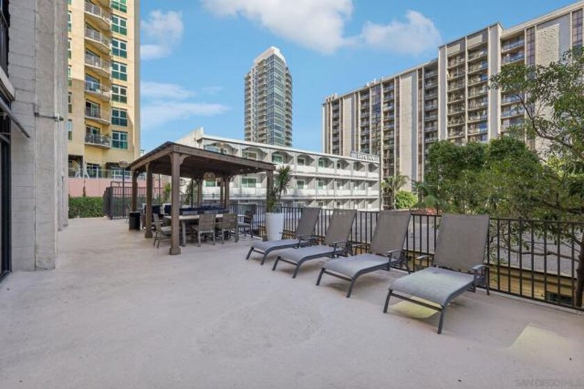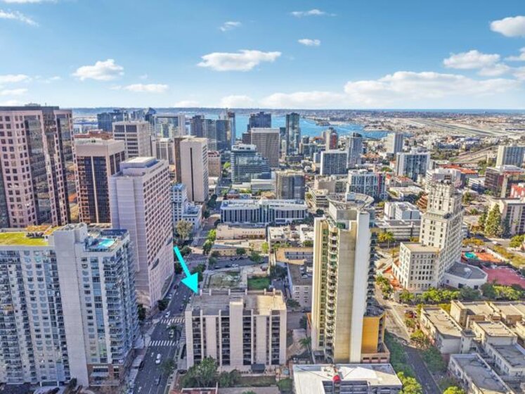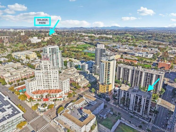 Discover spacious, light-filled living in this beautifully situated one-bedroom condo at Symphony Towers, a VA-approved community in the heart of Cortez Hill. Perfectly positioned, Cortez Hill offers peaceful residential living while providing effortless access to Downtown San Diego’s most vibrant neighborhoods. This super spacious 4th-floor residence features an open, airy floor plan with a large living room and dining area, framed by a wall of floor-to-ceiling windows with sliding doors that open to a covered private balcony. Enjoy fresh coastal breezes along with green treetop and city views—an ideal setting for relaxing or entertaining. The oversized bedroom comfortably accommodates a king-size bed, while the large bathroom includes a walk-in shower. Additional highlights include in-unit laundry and secure parking. Symphony Towers offers a pool, spa, fitness center, and inviting outdoor sitting areas, with modern updates currently underway throughout the common spaces. Just minutes from Balboa Park, strolls along the scenic harbor, East Village, Gaslamp Quarter, Little Italy, Petco Park, world-class dining, nightlife, and more—this home delivers the perfect blend of tranquility and urban convenience.