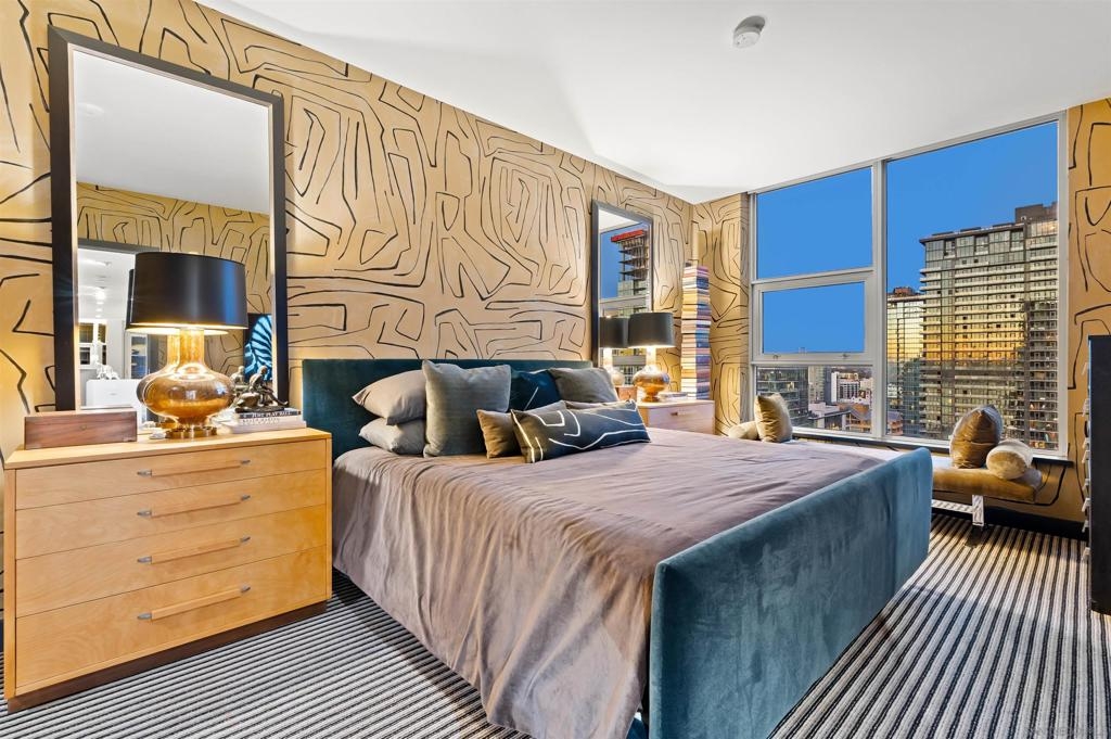 Welcome to Savina Residence 2705, a high-floor southeast corner home boasting sweeping views of the city skyline, bay, Coronado, and Point Loma. This spacious two-bedroom plus den, two-bath residence offers an open layout filled with natural light, thanks to expansive windows that perfectly frame the surrounding vistas. The kitchen is thoughtfully designed with high-end finishes and features an adjacent nook that functions beautifully as a home office or can be customized for additional storage. Notable upgrades include designer wallpaper—Cole & Son’s Nuvole from the Fornasetti Senza Tempo Collection and Kelly Wearstler’s Graffito—as well as wool carpeting by J. Mish in the bedrooms and motorized Lutron shades throughout. Savina is downtown San Diego’s newest luxury residential tower, located at the edge of Little Italy and the Columbia District. The building offers a comprehensive suite of resort style amenities including 24 hour concierge, EV charging, a pool and spa, state of the art fitness center, yoga terrace, social lounge, business center, pet retreat and grooming areas, steam and sauna rooms, bike tuning room, and indoor outdoor gathering spaces. Just steps from the waterfront and some of San Diego’s best dining and entertainment, Savina delivers a refined lifestyle in the heart of the city.