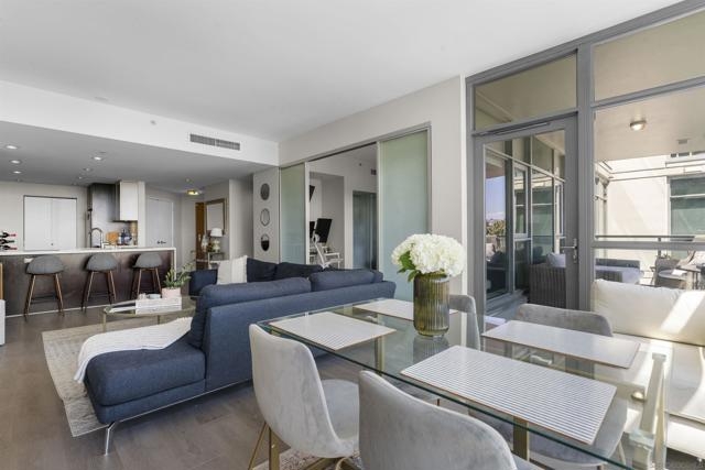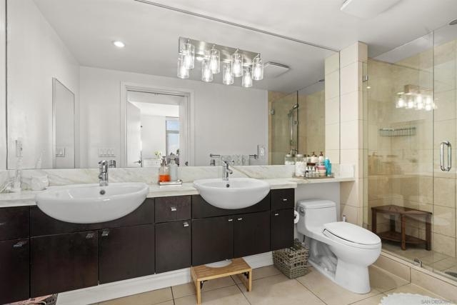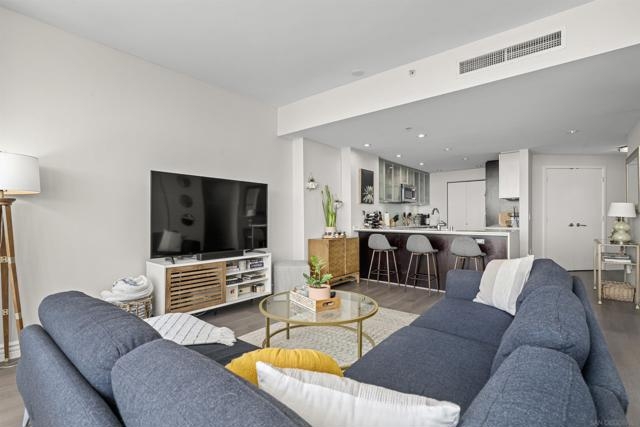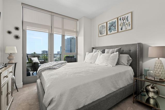Welcome to Aria, located in the exclusive Cortez Hill neighborhood. This impeccably designed 3 bedroom, 2 bathroom condo with exceptional views and almost 1,400 square feet of living space could be yours! Floor-to-ceiling windows invite in a significant amount of natural light, which compliments the new vinyl plank flooring in the living room, kitchen, third bedroom (currently staged as an office) and hallway. The remaining two bedrooms have newer neutral carpeting and motorized shades were added in the primary. The kitchen offers a substantial amount of storage which extends into the pantry as well. The laundry room is equipped with washer and dryer and contains built-in storage too. The 19x8 balcony (about 150 square feet) provides exceptional outdoor living space and is a perfect spot to relax and enjoy the views. Aria residents enjoy a large pool, spa, fitness center and common area. There is also bike storage on the first floor of the parking garage for all residents. The unit offers two assigned parking spaces as well and is minutes from Little Italy, Gaslamp Quarter, Petco Park and the Embarcadero.