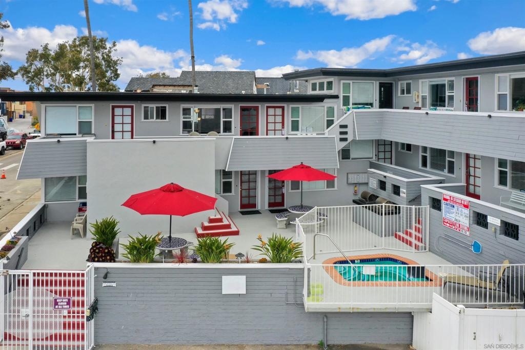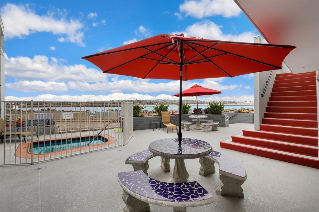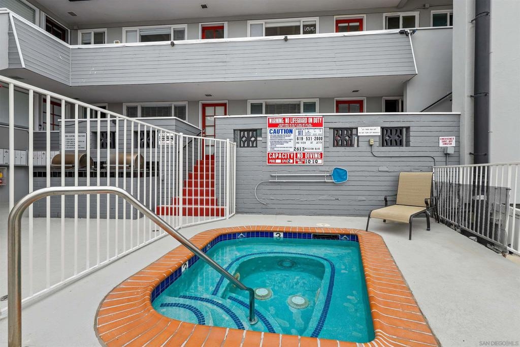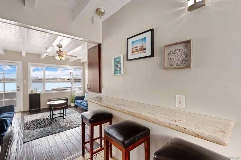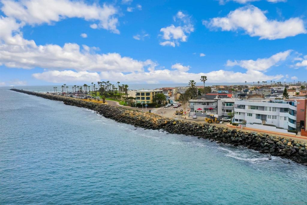 Grab your towel and flip flops, here is your opportunity to own a top floor unit with direct full water views in Mission Beach! This unit has been renovated throughout and lives larger than the actual square footage. An open concept floor plan is adorned by open beam shiplap ceilings over sit-down water views in the living room with cool ocean breezes flowing through every window. The kitchen has been reimagined to offer gas cooking, pendant lighting, granite countertops plus bonus bar seating or extra counter space. Genuine hardwood flooring and ceiling fans in the living room and bathroom. The bathroom has been fully-renovated to feature a stunning tiled shower surround with rain showerhead, custom lighting and mirror. Extra closet storage in the unit will help you stay organized. One assigned parking space is an asset when living in beach towns! Mission Point Views is a gated community perched upon a jetty overlooking the ocean that offers its residents a relaxing hot tub with water views, outdoor BBQ area, sauna, laundry facilities, bike room and storage. No need to drive, Ocean Front Walk/Bike Path is just down the street connecting you to cafes, restaurants, Belmont Park, boutiques, gastropubs and miles of sandy beaches. To see it is to love it!