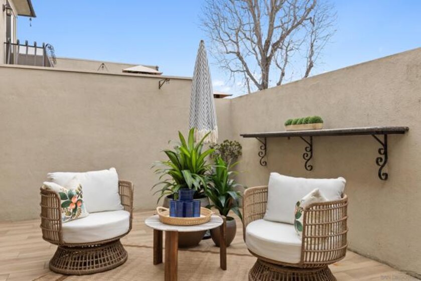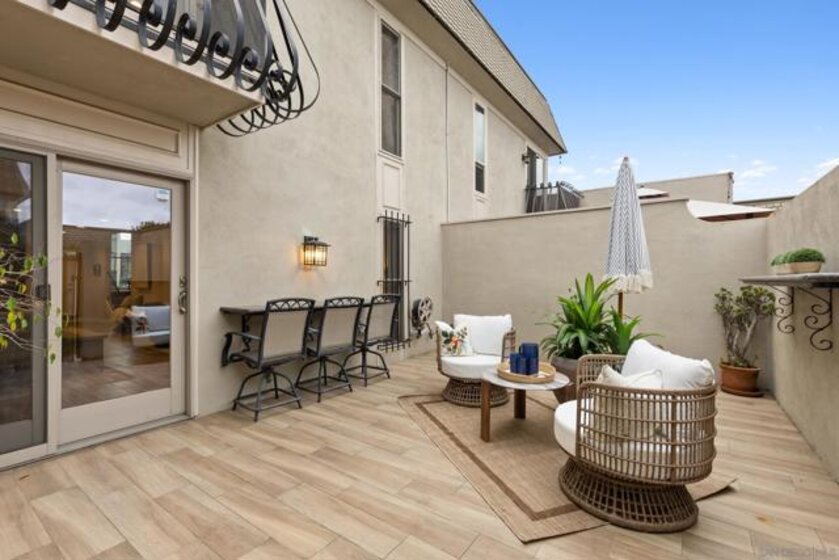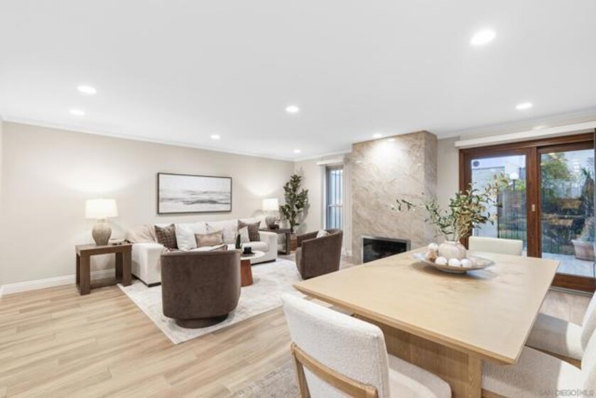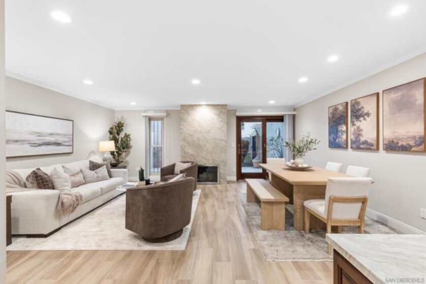 Welcome to this move-in ready, beautifully remodeled townhome in the highly sought-after Orleans East community. Although part of the gated Orleans E complex, this residence is uniquely positioned outside the gates, offering exceptional convenience and accessibility. Just minutes from the beach, this stunning home showcases high-quality designer upgrades throughout. Be prepared to be wowed by the bright, airy open-concept floorplan, enhanced by elegant crown molding and sophisticated recessed lighting, creating a truly refined, designer-inspired feel. The home features 2 bedrooms and 1.5 baths, highlighted by a generously sized primary bedroom complete with its own private balcony. The main level boasts stylish tile flooring, a modern kitchen adorned with striking quartzite countertops, and premium Jenn-Air stainless steel appliances. An electric fireplace insert adds warmth and ambiance, delivering the perfect blend of comfort and contemporary style. Step outside to a large private patio — ideal for relaxing, entertaining, or enjoying San Diego’s beautiful climate. Everyday living is effortless with an attached direct-entry two-car garage plus additional driveway parking. Residents enjoy the community pool, while the prime location offers outstanding proximity to major freeways (5, 8, 805, and 163), along with easy access to the shops, dining, and vibrant coastal lifestyle of Point Loma and Ocean Beach. VA approved complex