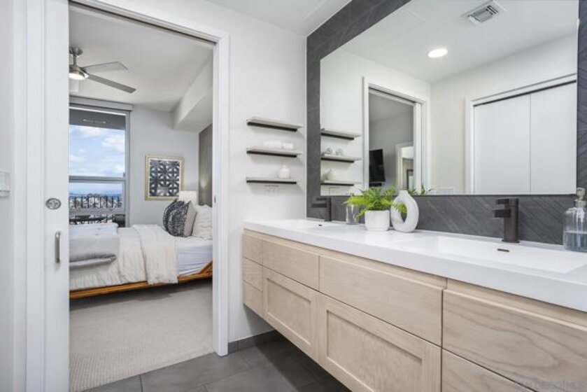 Experience elevated downtown living in this highly customized 2-bedroom, 2-bath residence at ICON, a premier concrete and steel high-rise in the heart of East Village. Sweeping northwest-to-southwest views stretch beyond the skyline to include the San Diego Central Library, distant mountain ranges, and glimpses of the bay. Floor-to-ceiling tinted windows frame the scenery while enhancing privacy and comfort throughout the home. Extensive custom upgrades set this residence apart, including a built-in Sonos sound system discreetly integrated within the walls for a clean, immersive experience. The primary suite is a true retreat, featuring automated blinds and a spa-inspired bath. A stackable washer and dryer are conveniently located in the in-unit closet, and nearly every detail has been thoughtfully customized for modern urban living. ICON delivers a secure, full-service lifestyle with controlled-access lobbies, underground parking, 24-hour on-site property management and staff, and residential trash chutes on every floor. The home includes secure two-car tandem garage parking. Residents enjoy a 1,700-square-foot fitness center with WiFi, a community theater room with raised seating and a 135-inch HD screen, and the 5th Inning Community Lounge with a full kitchen, TV, WiFi, and comfortable seating ideal for larger gatherings. The rooftop Skybox and viewing terrace, located across the street from Petco Park, offer unobstructed ballpark views with BBQs, surround sound, space heaters, and WiFi—perfect for enjoying games, concerts, and city events year-round!