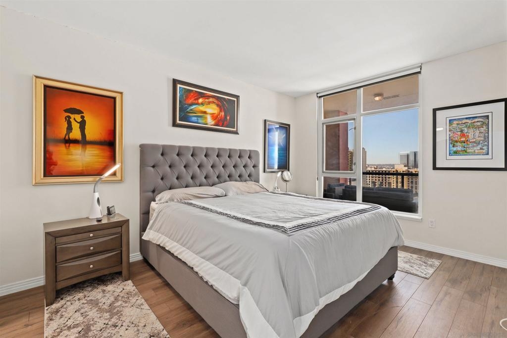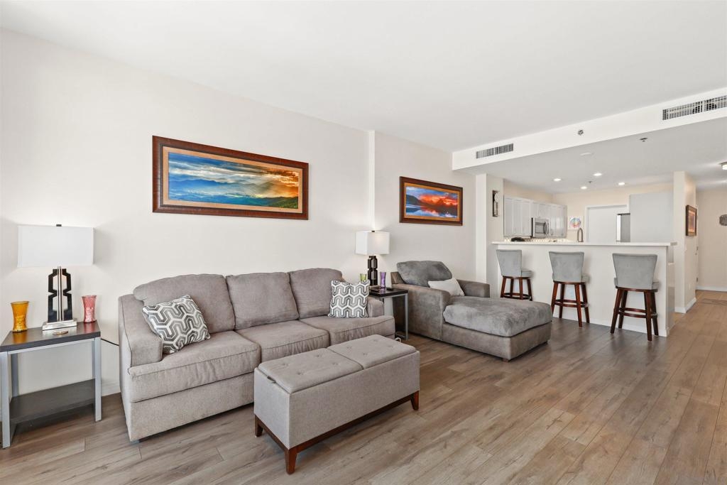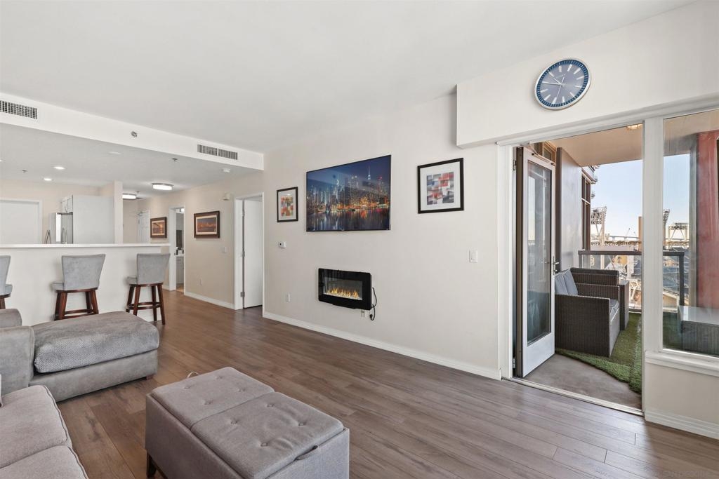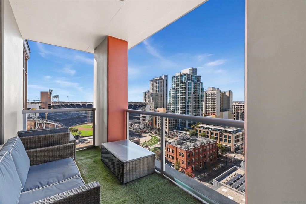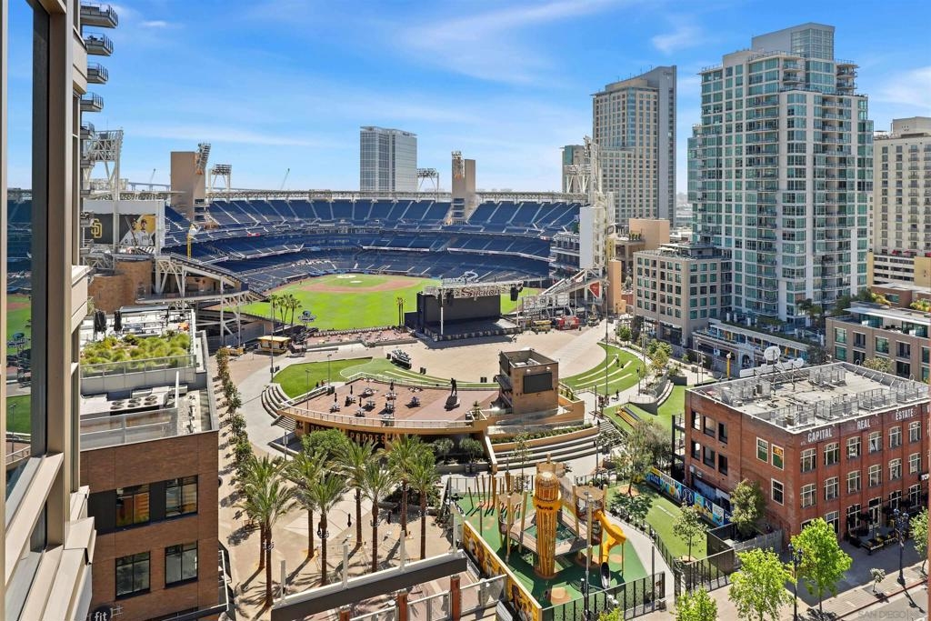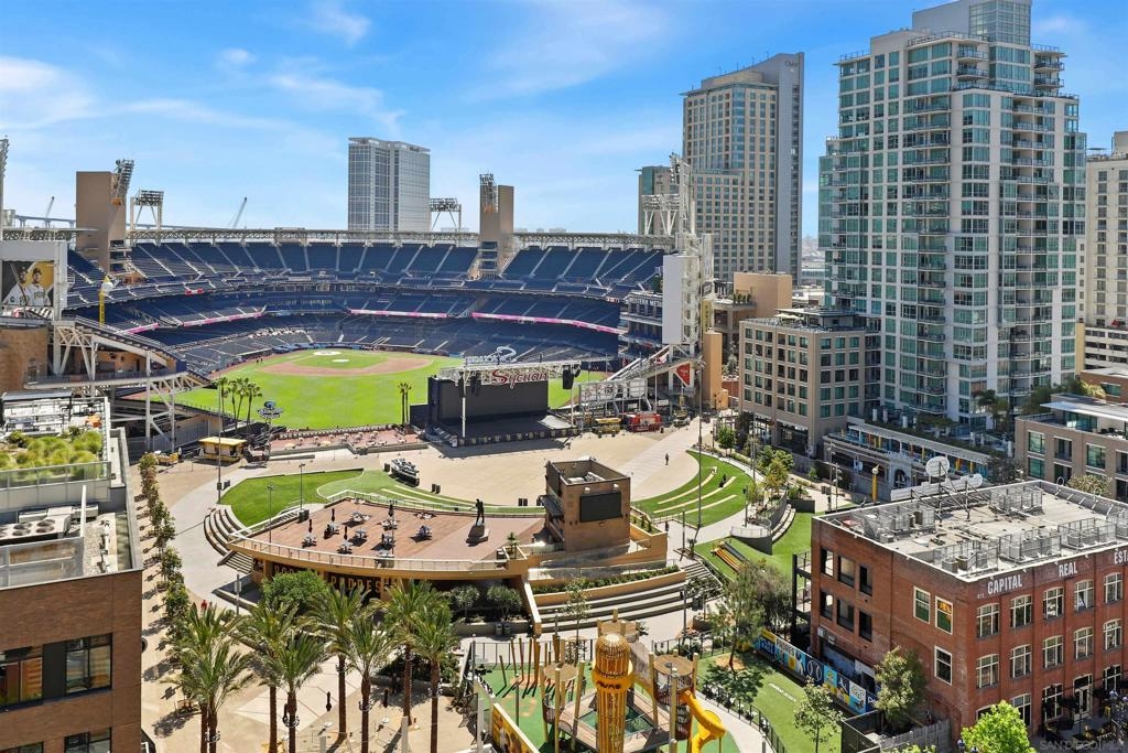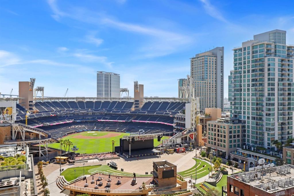 With a clear bird’s eye view into Petco Park, you might never want to leave home—enjoy FREE PADRES’ HOME GAMES, FREE CONCERTS, and FREE EVENTS right from your private 12th-floor balcony and living room. Take in stunning sunsets and panoramic sights of the city and Bay while you relax in comfort. Diamond Terrace features resort-style amenities and a prime Downtown location, so you can easily walk to everything that makes San Diego amazing—no driving necessary! Take in the energy of the city from the premium, covered community entertainment deck, or retreat indoors to peaceful serenity thanks to thick, noise-resistant floor-to-ceiling windows that fill your home with natural light. The open, flowing layout is beautifully finished with sleek laminate flooring throughout. The upgraded kitchen features quartz countertops, shaker cabinetry, and a bonus pantry for extra storage. Blackout shades in the bedroom provide restful sleep, while the spa-inspired bathroom includes a luxurious step-in shower with custom tile detailing. Enjoy the convenience of an in-unit laundry closet and an assigned parking space that makes parking effortless. Situated in the vibrant East Village, you're just steps from bars, restaurants, shops, entertainment, parks, dog areas, and the waterfront. Diamond Terrace boasts a stylish lobby, top-floor community room, fitness center, and an outdoor lounge deck with BBQs—perfect for catching events at Petco Park. With quick access to the 5, 163, and 94 freeways, this home is a true gem!